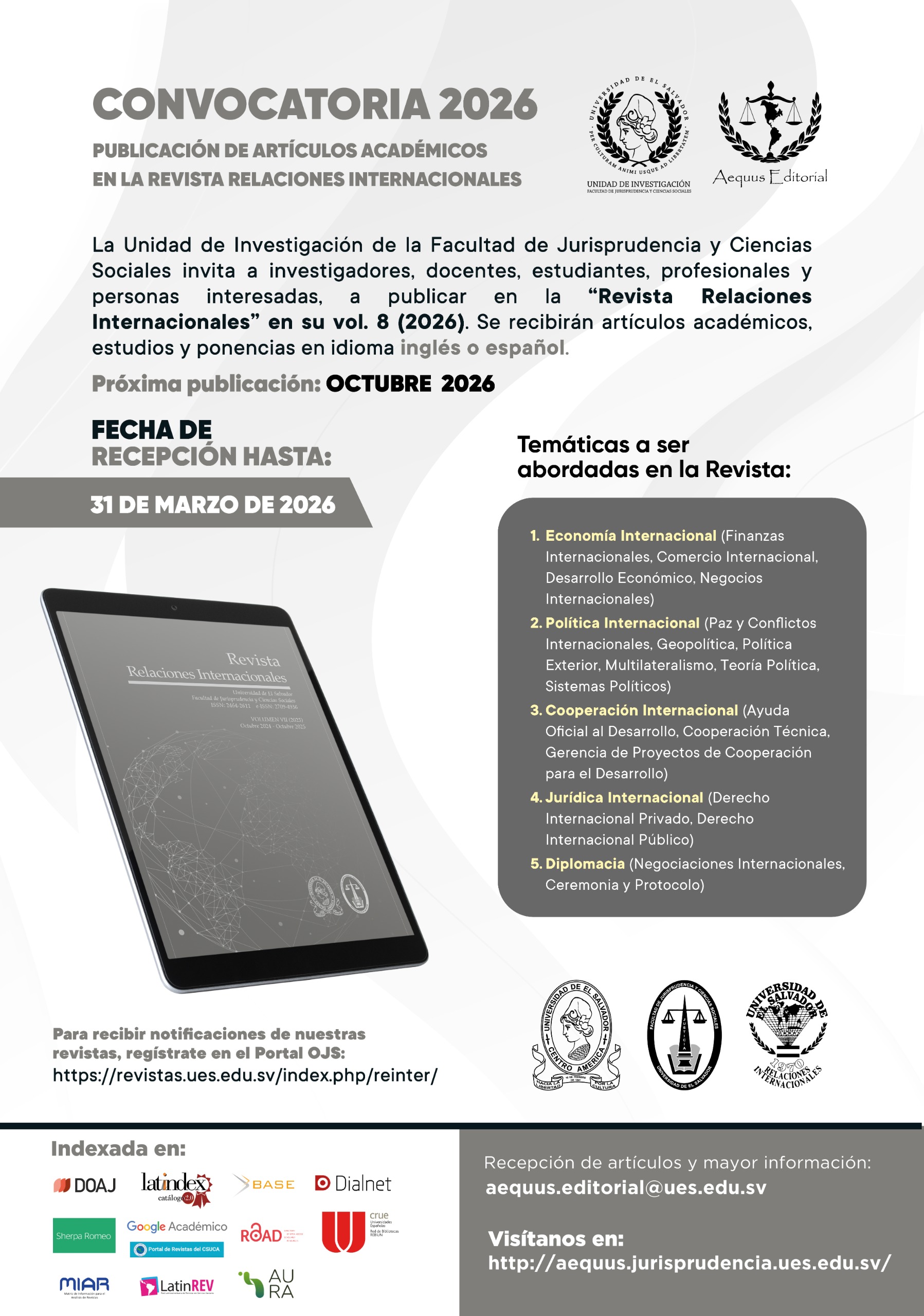 La Facultad de Jurisprudencia y Ciencias Sociales de la Universidad de El Salvador invita a todos los investigadores y profesionales en el área de las Relaciones Internacionales a contribuir para la Revista Relaciones Internacionales, en su octavo volumen para el año 2026.