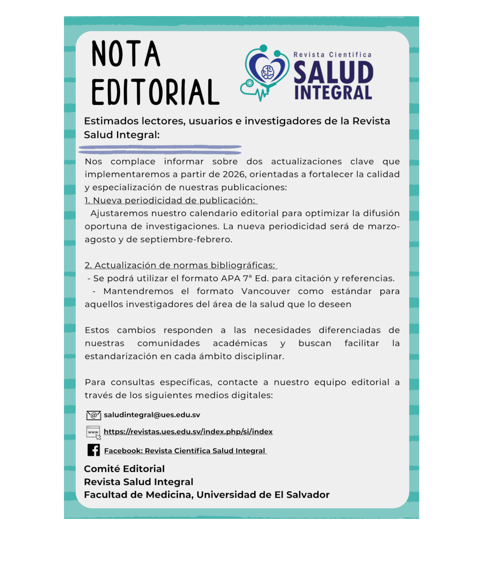 La Revista Salud Integral de la Universidad de El Salvador (UES) fue publicada inicialmente el 19 de agosto de 2023 (Vol.1 Núm1), desde esa fecha está a la disposición de la comunidad científica, academia y estudiantes del doctorado en Medicina y de las Ciencias de la Salud de la Facultad de Medicina. Así mismo, para profesionales de otras disciplinas de instituciones nacionales y extranjeras; fomentando una política de acceso abierto y gratuita a los lectores.